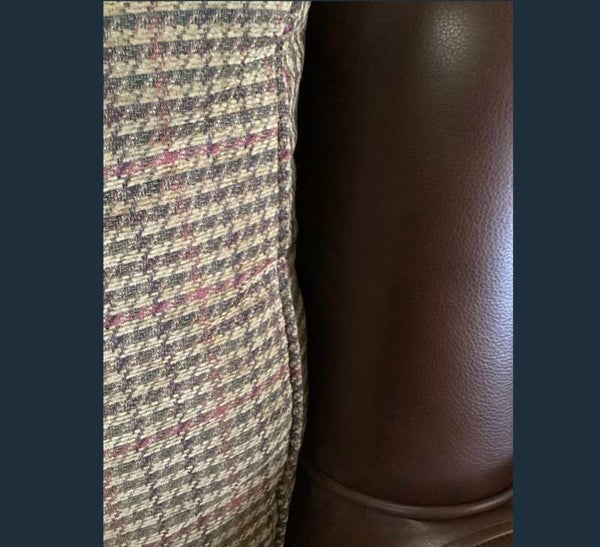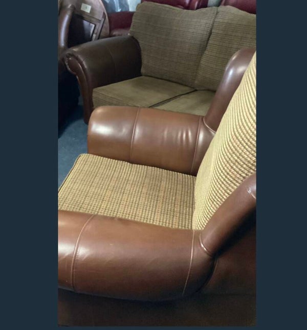 Brown faux leather with checked tweed look fabric cushions. 2 seater sofa & an armchair.